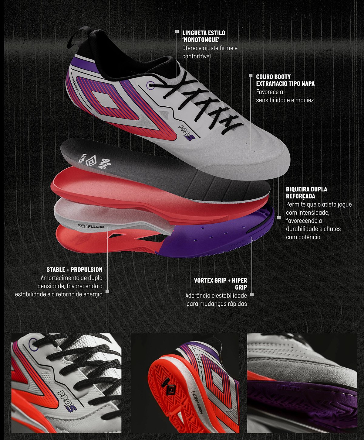 A nova Pro 5 Stable é a chuteira Pro 5 ideal para quem busca equilíbrio, controle e desempenho máximo no futsal. Com design moderno e materiais de alta performance, a versão atualizada da chuteira Pro 5 garante firmeza em cada movimento e sensibilidade no toque da bola, ajudando o atleta a se destacar em quadra. Detalhes da peça: - Amortecimento STABLE + PROPULSION para absorção de impacto e retorno de energia; - Solado de borracha com VORTEX GRIP e HYPER GRIP para mudanças rápidas de direção; - Estrutura leve e anatômica, oferecendo ajuste seguro e estabilidade; - Cabedal que aumenta o controle e a precisão no contato com a bola.